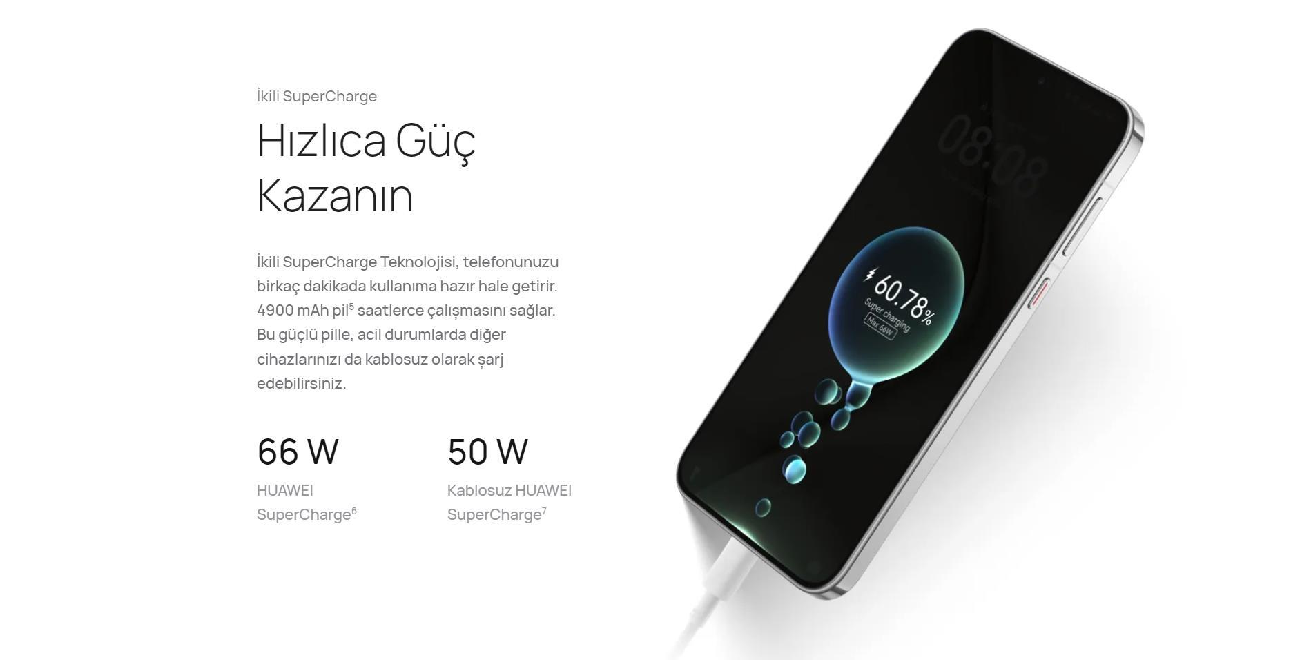 7. 50 W maksimum kablosuz şarj gücüdür ve yalnızca HUAWEI SuperCharge Kablosuz Şarj Cihazı Standı (Maks. 50 W/80 W) veya HUAWEI SuperCharge Kablosuz Araç Şarj Cihazı (Maks. 50 W/80 W) kullanıldığında (ayrı bir satın alma gerektirir), özel 66 W veya daha yüksek kapasiteli SuperCharge şarj adaptörü ve kablosu ile bu değere ulaşılabilir. Gerçek şarj performansı değişiklik gösterebilir.