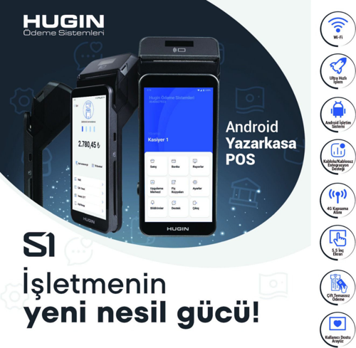 İşletmenizin ihtiyacı olan hız ve teknoloji, Hugin S1 ile yeniden tanımlanıyor. Sadece bir yazar kasa değil, işletmenizi geleceğe taşıyan akıllı bir terminal olan Hugin S1; Android 12 işletim sistemi, dört çekirdekli yüksek performanslı işlemcisi, ergonomik tasarımı ve kullanıcı dostu arayüzü ile satış süreçlerinizi kusursuzlaştırıyor.