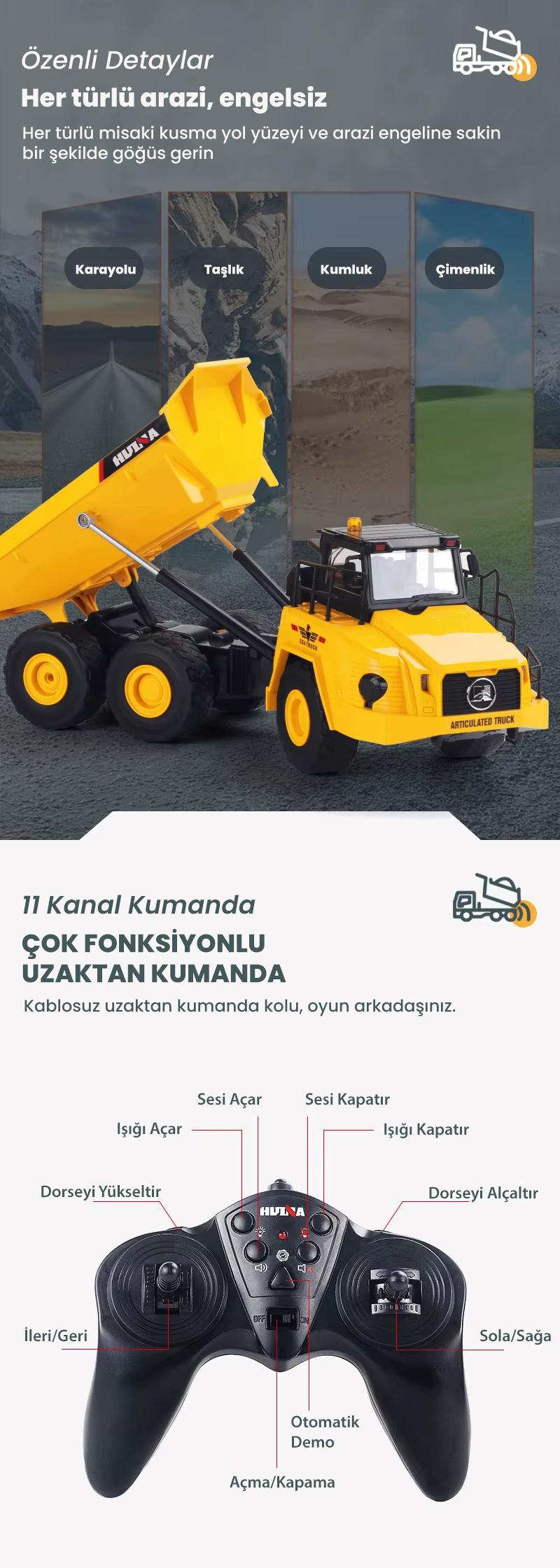 Huina HUINA 1553 1/24 11CH RC Model Damperli Kamyon Uzaktan Kumandalı Çok Fonksiyonlu İş Makinesi -2.4G Sesli&Işıklı