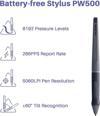 - Pilsiz Kalem - 266PPS rapor hızına ve 8192 basınç hassasiyet seviyesine sahip PW500 pilsiz dijital kalem, size doğa ve pürüzsüz çizgiler sağlar. ±60° eğim desteği gerçek fırça darbelerini taklit ederek size daha gerçekçi bir çizim deneyimi sunar.