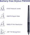 - Pilsiz Stylus PW500: EMR pilsiz teknolojisiyle PW500 kalemin pile veya şarja ihtiyacı yoktur. 8192 seviyeli kalem basıncı, 60 derece eğim fonksiyonu ve 266 pps rapor hızıyla birlikte, olağanüstü hassasiyet ve hızlı tepki veren kontrol ile elinizin doğal bir uzantısı olacak şekilde tasarlanmıştır ve size en doğal kağıda benzer çizim deneyimini sunar.