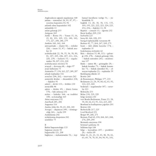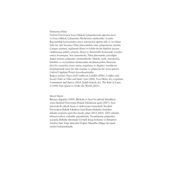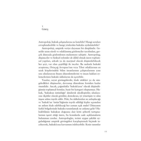 Bu kitabın merkezinde hukukun doğası, örf-âdetle ilişkisi, hukuki kuralların, kategorilerin ve taleplerin formu hakkındaki sorular bulunmaktadır. Kitap toplumsal düzene ve çatışmaların çözümüne dair etnografik çalışmaların yanı sıra insan hakları, uluslararası hukuk kuralları ve yeni mülkiyet biçimleri hakkındaki güncel tartışmaları da ele alıyor. Aynı zamanda, hukuk tarihçileri, klasikçiler ve oryantalistler tarafından çalışılan zengin bir kodlar ve metinler külliyatını da gözden geçiriyor: Antik Çin, Hindistan ve İslam dünyalarının antropologlarca ihmal edilen büyük hukuk sistemleri, bu dünyaların çeperlerinde üretilen hukuk formlarıyla birlikte bu kitapta inceleniyor. Eserde antik kodlar, Ortaçağ kanunları, köy tüzükleri ve kabile yasaları hakkında zengin ampirik ayrıntılar sunuluyor.