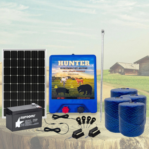 Hunter Ekonomik 2000 Metre Domuz - Ayı Kovucu Elektrikli Çit Sistemi, tarla, bahçe ve kırsal alanlarda yabani hayvanlara karşı etkili koruma sağlamak için tasarlanmış güneş enerjili ve akülü komple bir güvenlik sistemidir. 35.000 Volt çıkış gücüne sahip elektrizatörü sayesinde domuz, ayı ve benzeri yabani hayvanlara karşı güçlü ve caydırıcı bir bariyer oluşturur.