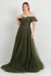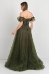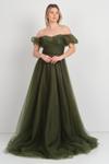 Kadın Düşük Kol Taş İşlemeli Kabarık Model Uzun Abiye Elbise 5700 Haki