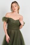 Hvit Vera Kadın Düşük Kol Taş İşlemeli Kabarık Model Uzun Abiye Elbise 5700 Haki