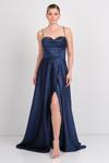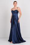 Detay: Göğsü taş işlemeli, askılı ve sırttan çapraz bağlamalı, drapeli tasarıma sahip maxi abiye elbise; parlak jarse kumaştan üretilmiş, astarlı ve fermuarlıdır;