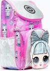 HYPE ile tanışın. x LOL Dancebot Sırt Çantası. Üstte ve yanlarda gümüş parıltıyla tasarlanan ince ombre kumaşın her yerinde LOL Bebek baskısı bulunur.