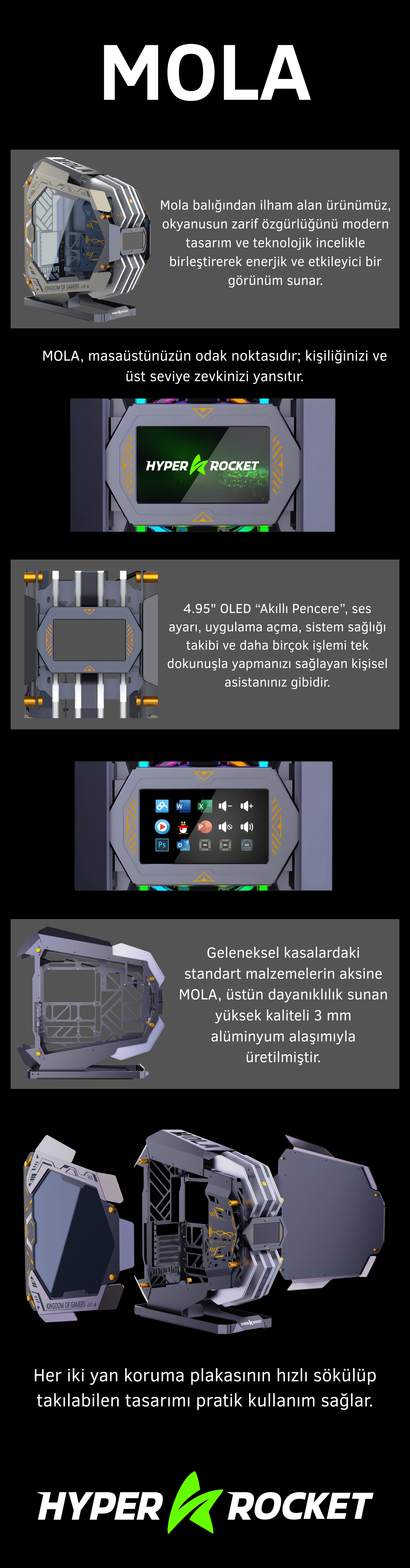 Hyper Rocket MOLA, alışılmış kasa tasarımlarının dışında konumlanan açık mimarili bir bilgisayar kasasıdır. Gövde yapısı; keskin çizgileri, açılı yüzeyleri ve farklı katmanlardan oluşan dış çerçevesiyle üç boyutlu bir iskelet görünümü sunar. Modelin genel formu, gövdeyi ortasında tutan bir taşıyıcı platform üzerine kuruludur ve kasayı zeminden yükselterek daha geniş hava sirkülasyonu sağlar.