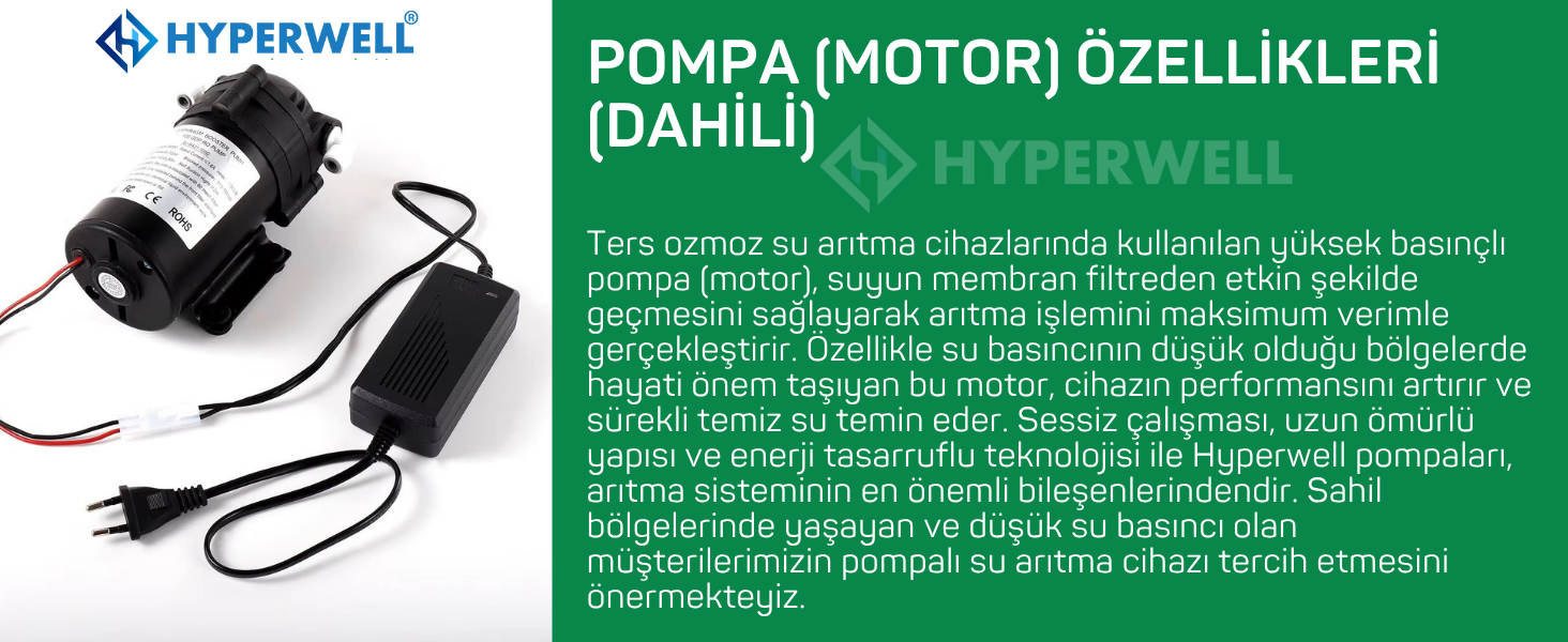 Hyperwell 13 Aşamalı Pompalı Su Arıtma Cihazı, ileri teknolojisiyle musluk suyunu doğanın saflığına geri döndürür. 13 aşamalı gelişmiş filtreleme sistemi sayesinde suyunuzdan tüm klor, tortu, ağır metal, kötü koku ve mikroorganizmaları arındırırken; aynı zamanda suya doğal mineraller, oksijen ve alkali denge kazandırır.