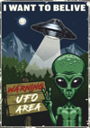 “Ben inanmak istiyorum!” Bu retro ahşap tablo, 90’lardan kalma X-Files esintisini günümüze taşıyor. Arka planda karanlık orman, yukarıdan ışık saçan uzay gemisi ve ön planda barış işaretiyle poz veren sevimli bir yeşil uzaylı figürü. Altında ise ikaz: “WARNING: UFO AREA” 😄