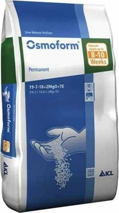 Osmoform Permanent 19-7-18 (25 kg), uzun etkili ve kontrollü salınımlı yapısıyla süs bitkileri, çalılar, fidanlar ve peyzaj alanlarında düzenli besin ihtiyacını karşılamak amacıyla geliştirilmiş profesyonel bir bitki gübresidir. 19-7-18 formülü bitkiye güçlü azot desteği, yeterli fosfor ve yüksek potasyum sağlayarak dengeli ve sürekli büyüme sunar.