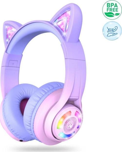 iClever Kedi Kulaklı Led Işıklı Güvenli Ses Sınırlı 50 Saat Oynatma Süreli Bluetooth Çocuk Kulaklığı Granit Pembe