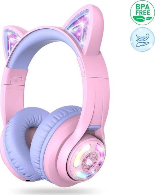 iClever Kedi Kulaklı Led Işıklı Güvenli Ses Sınırlı 50 Saat Oynatma Süreli Bluetooth Çocuk Kulaklığı Lila