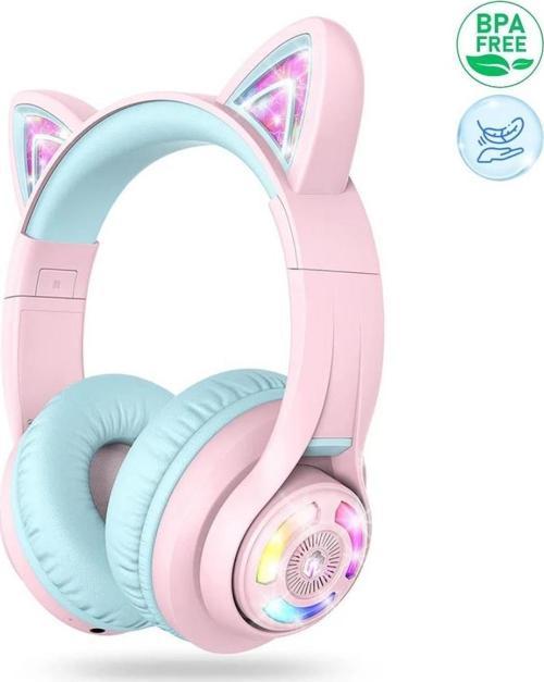 iClever Kedi Kulaklı Led Işıklı Güvenli Ses Sınırlı 50 Saat Oynatma Süreli Bluetooth Çocuk Kulaklığı Pembe