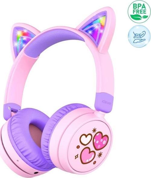 iClever Kedi Kulaklı Led Işıklı Güvenli Ses Sınırlı 60 Saat Oynatma Süreli Bluetooth Çocuk Kulaklığı Mor