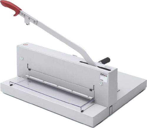 Ideal 4300 Profesyonel Kollu Giyotin 430 mm geniş format kesim ölçüsü 200 yaprağı (20mm) kadar kesme kapasitesi. yüksek kaliteli Solingen çeliğinden imal edilmiş kesme bıçakları, saf çelik bıçak taşıyıcısı, özel olarak sertleştirilmiş çelikten yapılmış ayarlanabilir bıçak kılavuzları, ölçü göstergeli yan yaygılar,milli ve kılavuzlu arka poza, arka poza ayar kolunda kalibreli göstergesi ile ince ayar özelliği, metal konstrüksiyon. Teknik Özellikleri • Kesme Kapasitesi : 200 Yaprak • Tabla Ölçüsü : 43 x 34 cm • Kesme genişliği : 43 cm • Sıkıştırma : Manuel • Kağıt Hizalama : Manuel • Ölçüler : 470x720x575 mm • Ağırlık : 30,5 kg • Garanti : 2 yıl
