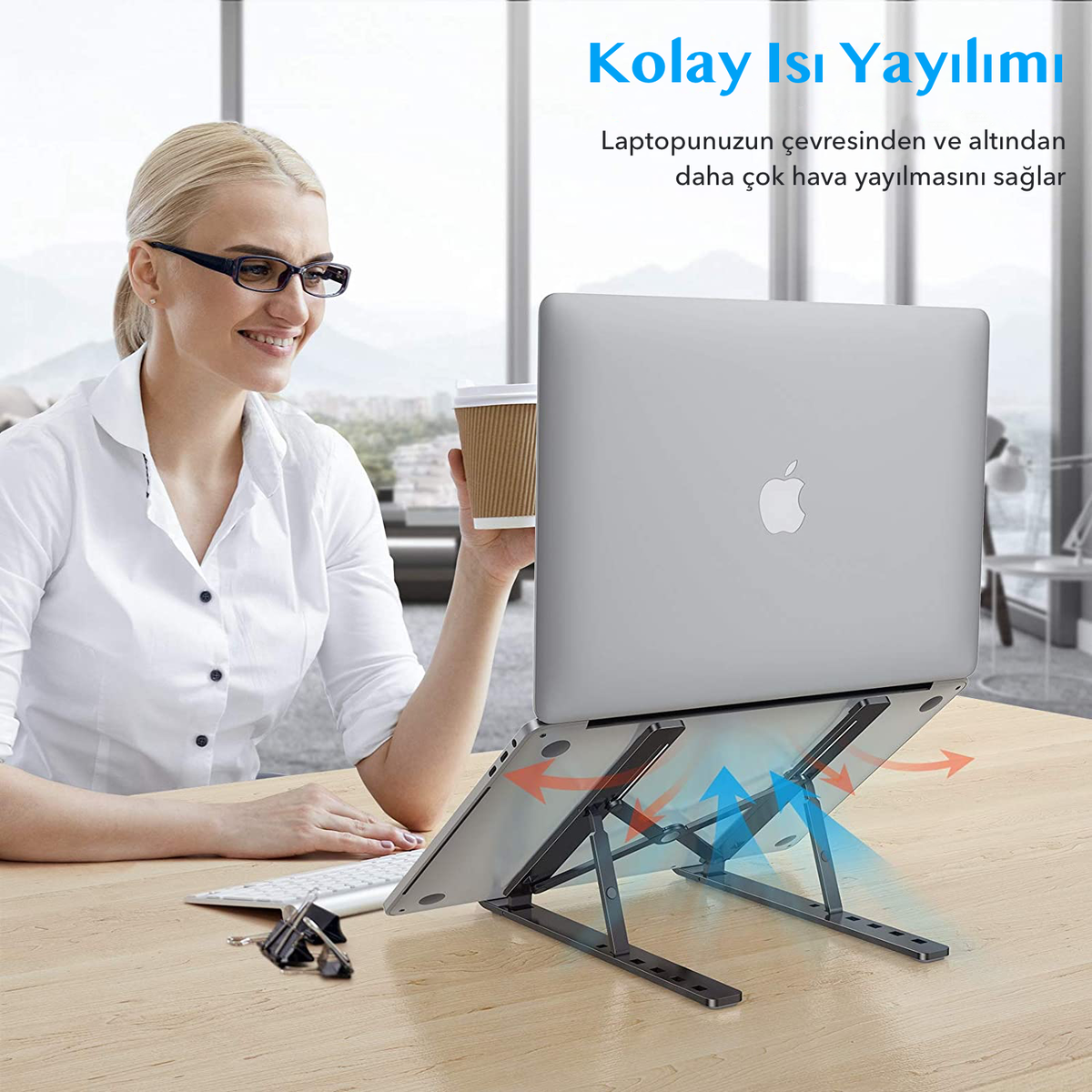 Koruyucu Ped: Standın yüzeyi etrafındaki yumuşak silikon ped kaymayı ve çizilmeleri etkili bir şekilde önleyecektir. Kararlı üçgen sağlam tasarım, cihazları sallanmadan yerinde tutar, cihazı daha güvenli tutmak için sürtünmeyi arttırır. Ergonomik Tasarım: Tablet tutucumuz 6 kademeli yükseklik ve açı ayarı sunar, dizüstü bilgisayarınızı yazarken ve görüntülemede daha rahat bir duruş elde etmek için 55mm'den 155mm'ye kadar özgürce yükseltebilir, ekranınızın üzerine eğilmesini önleyebilir, omurga, boyun ve omuz gerginliğini azaltır. Laptopunuz için Soğutma Sağlar: Altı açık dizüstü bilgisayar stand tasarımı ile, ısının hava ile temasını sağlar ve dizüstü bilgisayarınızın hava akışını artırır. Katlanabilir tasarıma sahiptir, kolayca katlanabilir ve dizüstü bilgisayar çantanıza veya herhangi bir sırt çantasına yerleştirilebilir.