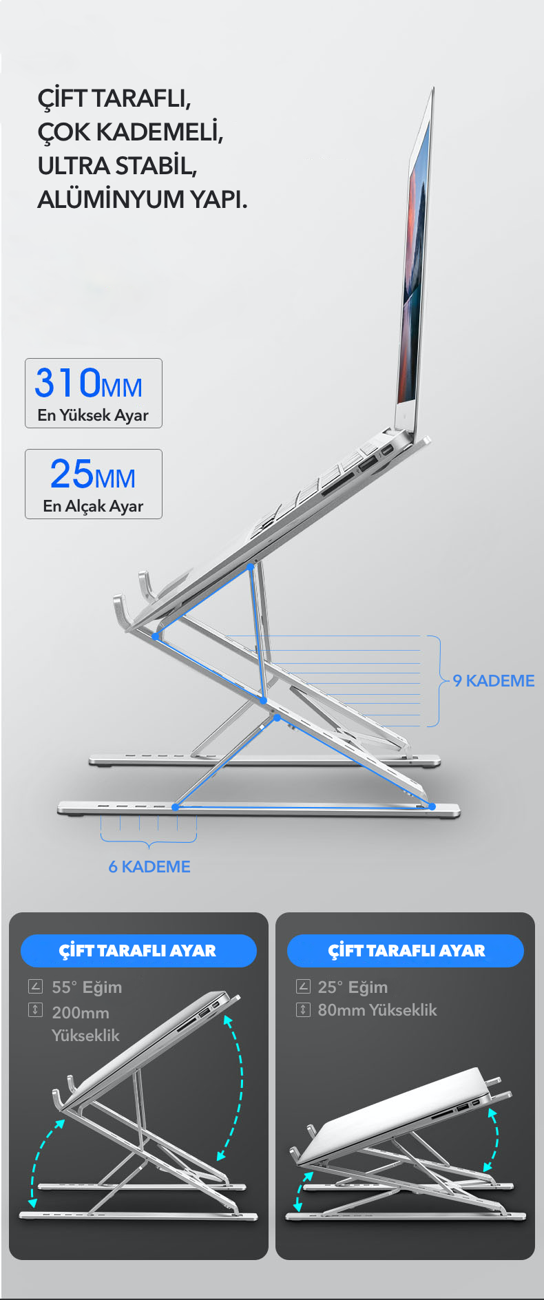 - 340g. - Ölçü (Stand Tamamen Kapalıyken): 290mm x 45mm. - 12.6" ila 17.3" Tüm Laptop Bilgisayarlarla Kullanılabilir.- Alüminyum Çok Dayanıklı Yapı.- Mükemmel Dengesiyle Bilgisayarınız Devrilmez.