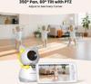 - [2 Kamera, Otomatik Takip ve 4X Yakınlaştırma ile Eksiksiz Bebek Odası Görünümü] Bebek odasının her köşesini zahmetsizce görün. 2 kameralı (dahil) bu bebek telsizi, ikizleri veya farklı açılardan izlemek için bölünmüş ekran görüntülemeyi destekler. Motorlu taban, pan-tilt yakınlaştırma kontrolü için 350° pan ve 60° tilt sağlarken, 4x yakınlaştırma en küçük ayrıntılara odaklanmanızı sağlar. Otomatik takip özelliği, bebeğinizin hareketlerini nazikçe takip ederek tam kapsama alanı sağlar ve her zaman kadrajda kalmalarını sağlar.