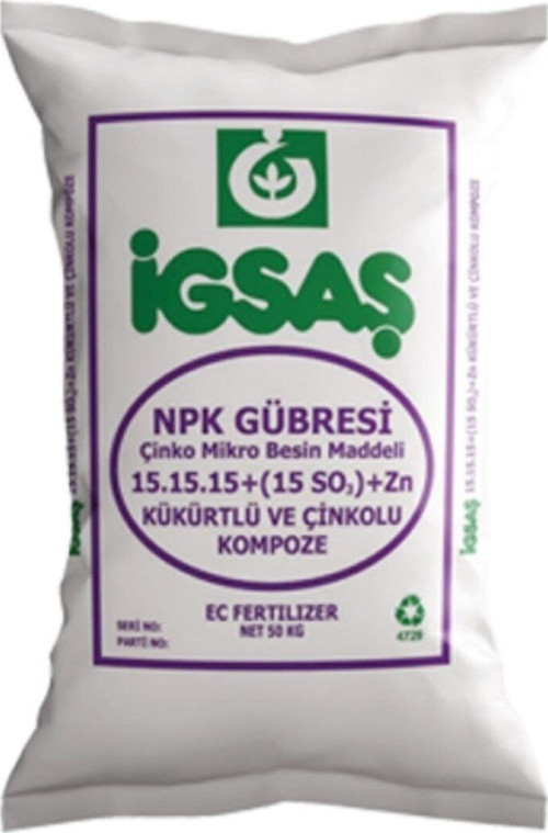 SÜPER 15.15.15 +ZN KOMPOZE GÜBRE TABAN GÜBRESİ Azot, fosfor ve potasyum ihtiyacı olan topraklar için uygun bir kompoze gübredir. Bu gübrenin 100 kg%27ında 15 kg azot (N), 15 kg fosfor (P2O5) ve 15 kg potasyum (K2O) mevcuttur. GÜBRECİM FARKI İLE AYNI GÜN KARGODA!