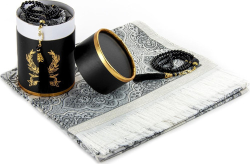 Seccadeli ve İnci Tesbihli Özel Silindir Kutulu Set Siyah Renk