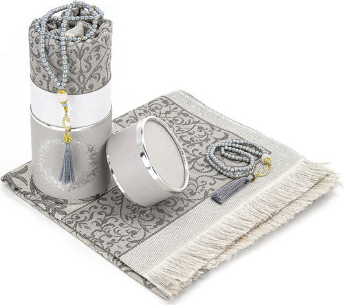 Çeyizlik Hediyelik Silindir Kutulu, İnci Tesbihli Seccade Seti - Gri