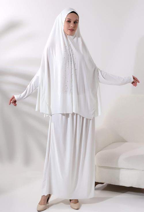 İki Parça İncili Taşlı Alt Üst Pratik Namaz Elbisesi 8017 Beyaz