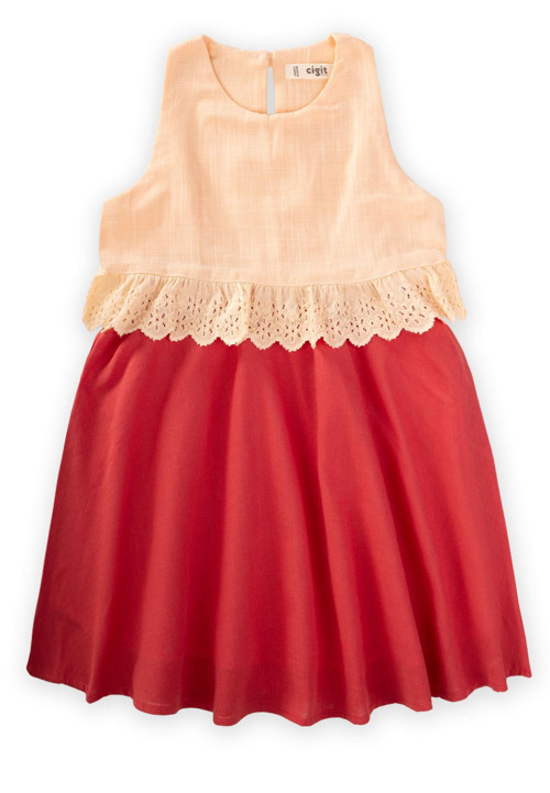 Cigit İki Renkli Beli Dantelli Elbise 2-7 Yaş Yavruağzı
