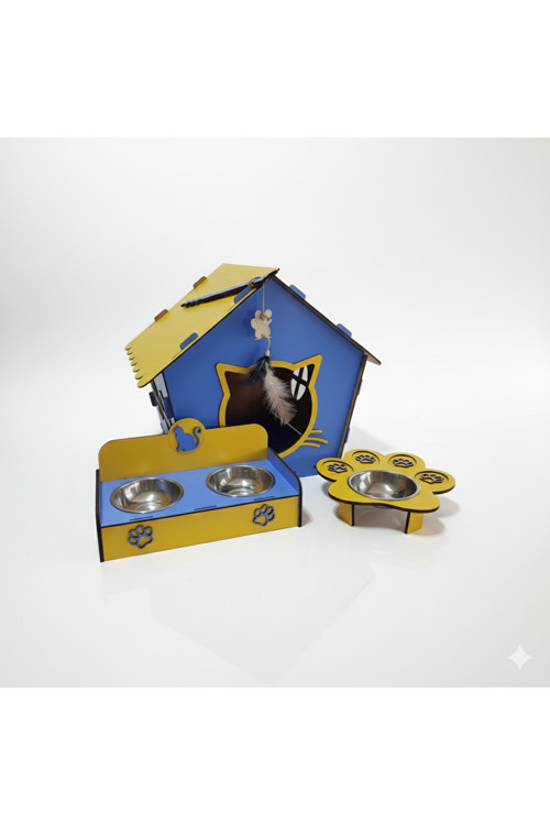 İkonixpet Canlı Mavi Sarı Kedi Evi Mama Su Kabı Seti - Eğlenceli Tasarım Evcil Dost Oyun Ve Beslenme Alan