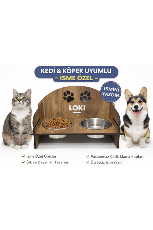 İkonixpet Kişiye Özel Ahşap Kedi Köpek Mama Kabı – İsim Yazılabilir, Çift Hazneli Paslanmaz