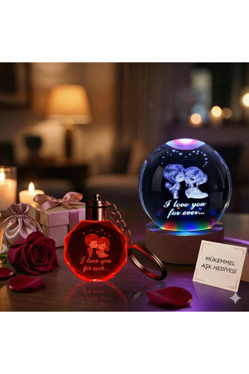 İkonixpet Sevgililer Günü Işıklı Kristal Cam Küre Led Lamba + Anahtarlık | Romantik Hediye Seti