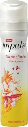 Impulse Deo Sprey 75 ml Sweet Smile, Impulse'un her dürtünüze uyacak çeşitli heyecan verici ve taze kokular içeren vücut spreyi serisinin bir parçasıdır. Bu mükemmel 75 ml boyutu, sırt çantanıza kolayca sığabileceği ve okulda, spor salonundan sonra veya hareket halindeyken keyfini çıkarabileceğiniz anlamına gelir. Her zaman, her yerde bu kokunun tadını çıkarın ve Dürtülerinize Güvenin.