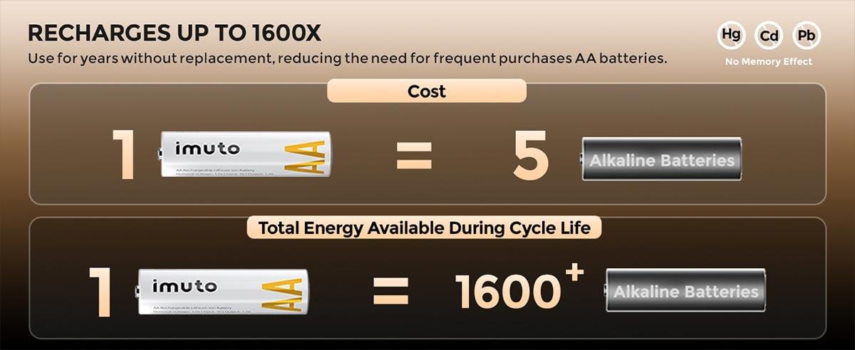 Imuto AA lityum pillerin öne çıkan en önemli avantajlarından biri, yaklaşık 1600 şarj döngüsüne sahip olmalarıdır. Bellek etkisi oluşturmadan uzun yıllar kullanılabilir ve tek kullanımlık alkalin pillerin yerini alarak hem maliyeti ciddi ölçüde azaltır hem de çevresel atığı en aza indirir. Ayrıca düşük kendi kendine deşarj oranı sayesinde kullanılmadan uzun süre beklese bile enerjisini korur ve her zaman hazır güç sunar.