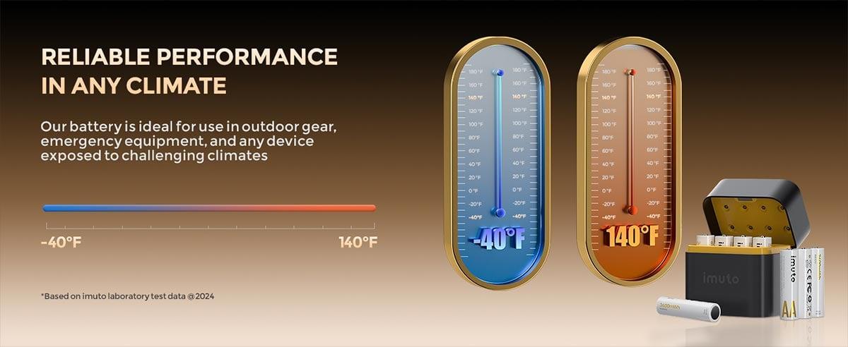 Imuto AA lityum piller, -40°F ile 140°F arasında geniş bir sıcaklık aralığında güvenilir şekilde çalışabilir. Bu özellik sayesinde dış mekân güvenlik sistemlerinden güneş enerjili lambalara kadar pek çok üründe dört mevsim sorunsuz performans sunar. Ayrıca yüksek güç gerektiren cihazlarda bile uzun ömürlü ve kararlı enerji sağlayarak günlük kullanımı daha pratik ve ekonomik hale getirir.