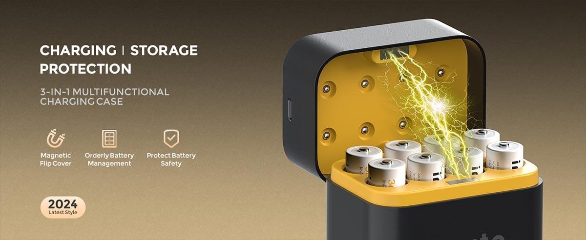 8 yuvalı hızlı şarj kutusu, aynı anda 1’den 8’e kadar AA pili şarj edebilir. Yaklaşık 3 saat içinde tam doluluğa ulaşan bu sistem, NiMH pillere göre %40’a kadar daha verimlidir. Type-C girişli tasarımıyla 5V/3A adaptör kullanıldığında yüksek hızlı şarj imkânı sağlar. Şarj kutusunun manyetik kapaklı yapısı, darbeye karşı koruma sunarken nem, toz ve sıvı sıçramalarına karşı ek güvenlik sağlar.