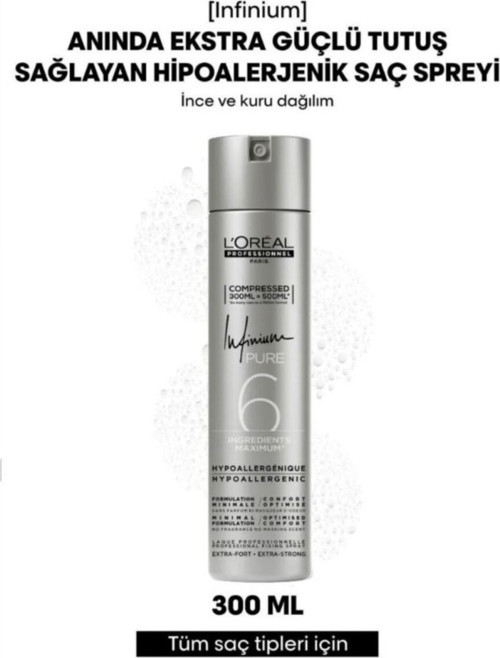 Infinium Pure Extra Fort - Extra Strong Saç Spreyi 300 Ml - Yeni Ambalaj ; L'Oréal Professionnel Infinium Extra Güçlü Tutuşlu Saç Spreyi ; Profesyonel sabitleyici sprey.; ; Ekstra güçlü tutuşlu, parfümsüz ; uygulama sırasında nötr koku.; ; Mükemmel profesyonel difüzyonumuz ; optimize edilmiş konfor, yoğun kullanım için uyarlanmış,anında sabitleme etkisi, görünür kalıntı yok.; ; Mükemmel parlaklık.; ; Saçın bir bölümünü ya da tamamını saçı katılaştırmadan anında sabitler.; ; Uzun süre etkili ve kalıcı saç şekilleri oluşturur.; ; Nemin saç şeklini bozmasını engeller.; ; Saç yüzeyinde parlak ve ışıltılı bir görünüm oluşturur.; ; Yapışık ve yağlı bir his bırakmadan saçı şekillendirir.; ; Kalıntı ve tortu bırakmaz.; Fırça veya şampuan ile kolayca saçtan arınır.; ; Saçta güçlü tutuş sağlar.; ; Sonlandırma ürünü olarak kullanın.; ; Kuru saça 30 cm uzaktan püskürtün.; ; Daha fazla hacim etkisi için saç diplerine uygulayın.; ; Bir bölümü belirginleştirmek için daha yakından püskürtün ;