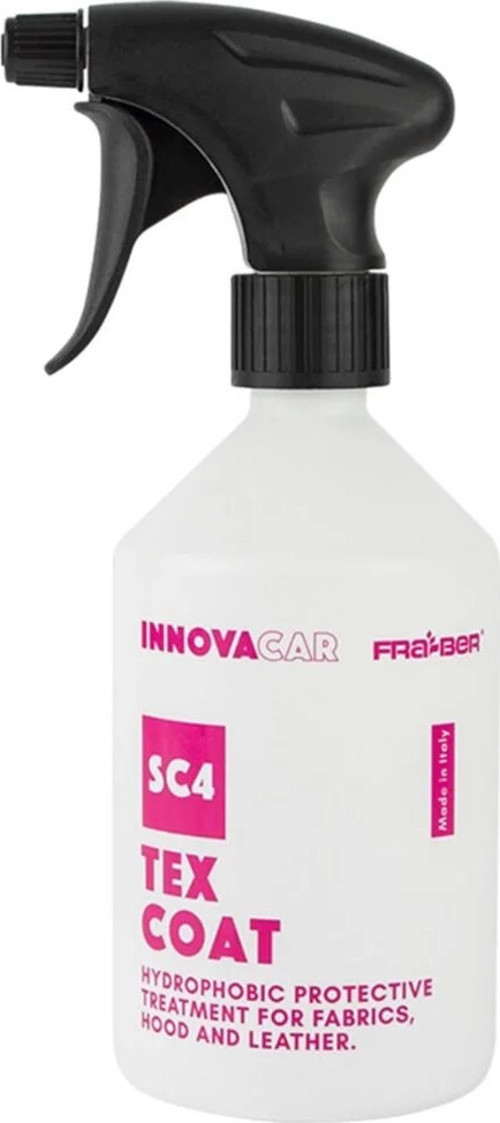 INNOVACAR SC4 TEX COAT Kumaş ve Deri Hidrofobik Koruyucu, floropolimer bazlı formülü sayesinde kumaşlar, deri yüzeyler ve yumuşak tenteler üzerinde kimyasal ve moleküler bir bariyer oluşturan alkol bazlı bir yüzey koruyucudur. Yağlandırma yapmadan yüzeyi korur ve sonraki temizlik işlemlerini kolaylaştıran anti-statik bir etki sağlar.