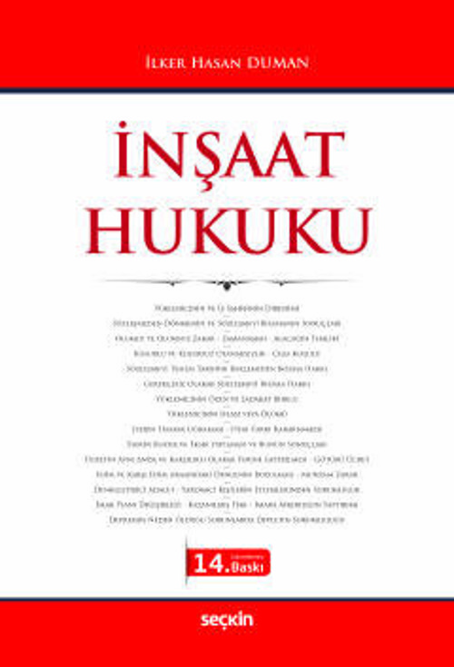 Seçkin Yayıncılık İnşaat Hukuku İlker Hasan Duman 14. Baskı, Nisan 2025 9786253810498 Kitapta, sözleşmenin kurulması, tarafların borçları ve hakları, sözleşmenin sona ermesi gibi geleneksel konulardan başka, Kamu Yapım Sözleşmeleri, Yap-İşlet-Devret Sözleşmeleri, Gelir Paylaşımlı İnşaat Sözleşmeleri, Müşavir Mühendislik Sözleşmeleri, Yapı Denetim Sözleşmeleri, Yükleniciden Alacağı Bulunan Üçüncü Kişilerin Arsa Sahibi Aleyhine Tapu İptal ve Tescil Davası Açması, Sözleşme Adaleti, İnşaat Devam Ederken Arsanın Satılması, Sorumsuzluk Anlaşması, Şerhlerin Kaldırılması, Sözleşmenin Tasfiyesi, Olumlu ve Olumsuz Zarar Hesabı, Kesin Hesap ve Hakedişin Düzenlenmesi, Karinenin İnşaat Hukukundaki Yeri, Sözleşmenin Devredilmesi gibi pek çok konu yer almaktadır. Eserde ayrıca, bilimsel bilgi yanında (işlenmiş durumda) yargı kararlarına da yer verilmiştir. Bu kitap, herkes için bir başucu kitabı olacaktır. Ayrıntılara verilen önem sebebi ile artık kimse, sorunuma kitaplarda açıklama bulamadım diyemeyecektir.