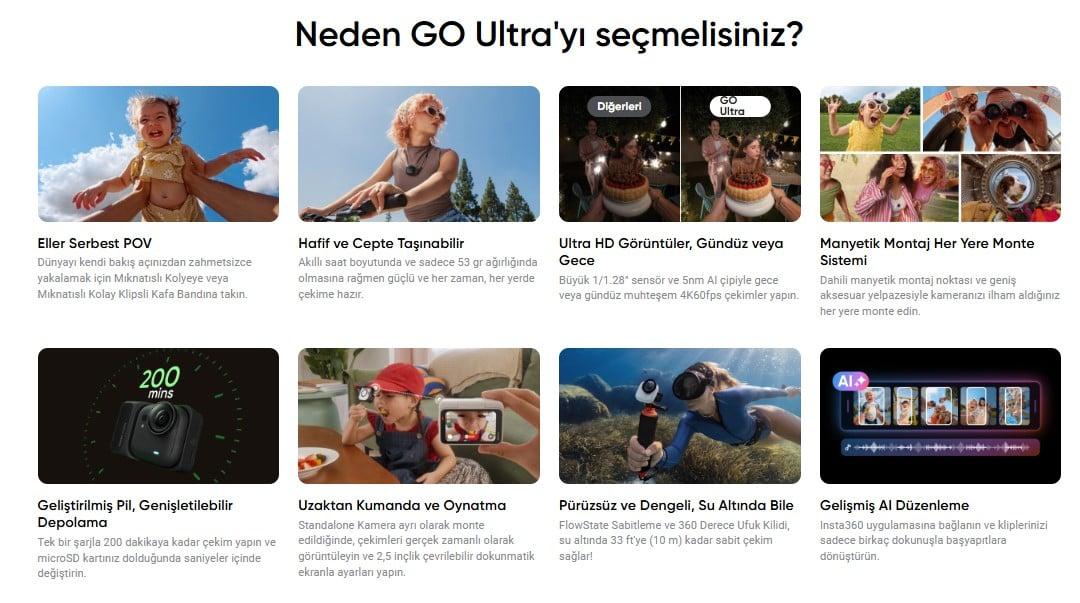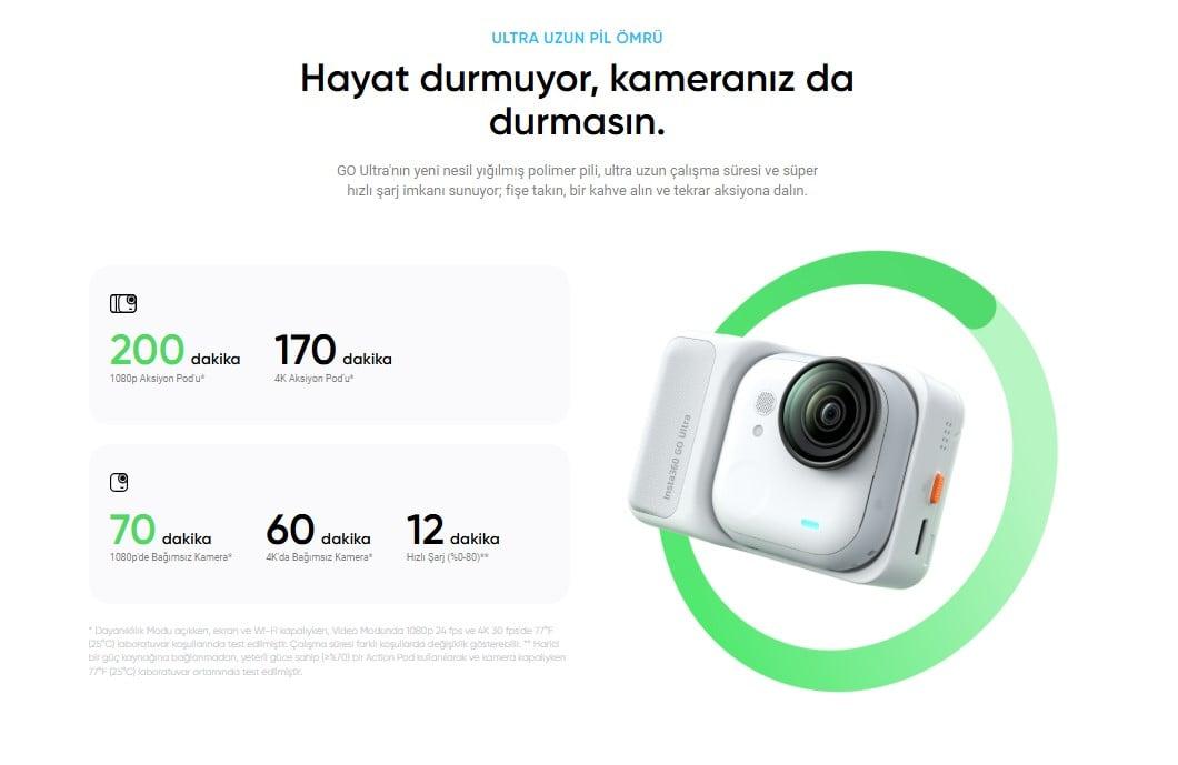 Ürün Açıklaması:Verimli video, fotoğraf ve ses kaydı için geliştirilmiş özellikleriyle Insta360 GO Ultra , bir sonraki maceranızı yüksek kaliteli görüntülerle yakalamanızı kolaylaştırmak için tasarlanmıştır. Geliştirilmiş PureVideo Modu, 2,5 inç çevrilebilir dokunmatik ekran, dört ses kayıt modu ve daha uzun pil ömrü, GO Ultra'nın genişletilmiş özelliklerinden bazılarıdır. GO Ultra, artırılmış 1/1,28 inç görüntü sensörüyle 4K60 video ve 50 MP'ye kadar çekim yapabilir. Bu Creator Package sürümü, gönül rahatlığıyla montaj yapmanızı sağlayan bir selfie çubuğu, pivot standı, hızlı açılan montaj aparatı, mıknatıslı kolye ucu, manyetik kolay klips ve hızlı açılan emniyet kordonu içerir.Insta360 GO Ultra Creator Bundle (BEYAZ) en iyi fiyatla