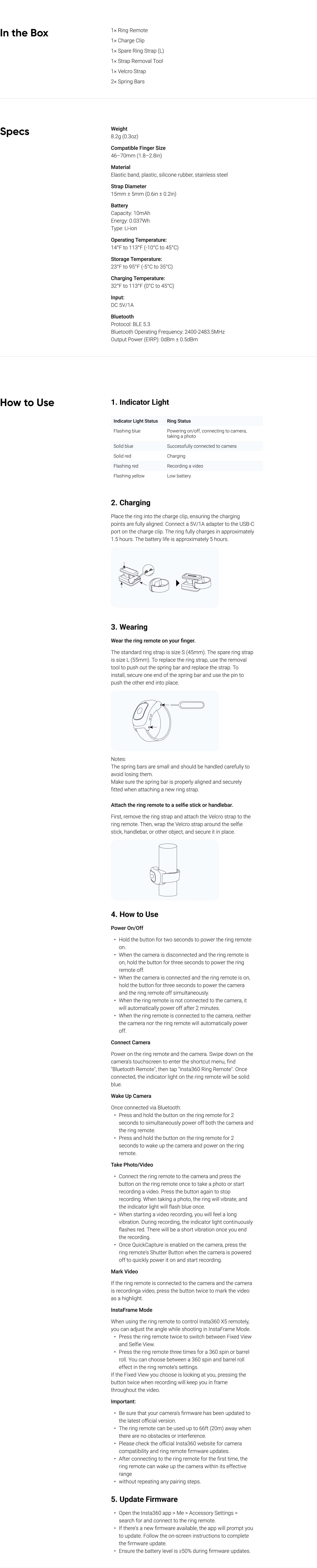 - Halka uzaktan kumanda şu anda yalnızca Insta360 X5, Insta360 GO Ultra ve Insta360 Ace Pro 2 ile uyumludur. Gelecekteki uyumluluk güncellemeleri için lütfen resmi Insta360 web sitesini kontrol edin.
