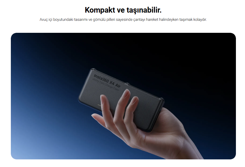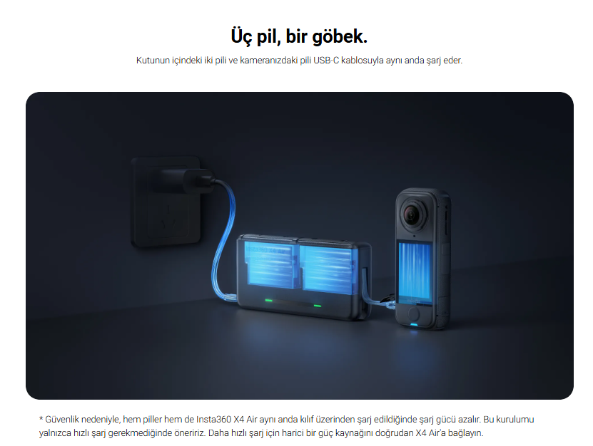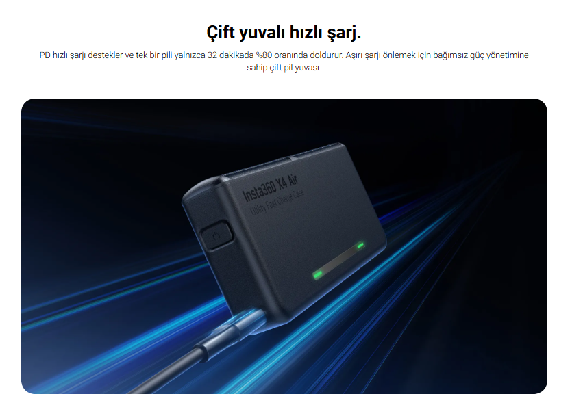 PD hızlı şarjı destekler; bir pili yalnızca 32 dakikada %80 oranında şarj eder. Her cebe veya çantaya sığacak kadar ince ve kompakt form faktörü. Her zaman, her yerde kolayca pilinizi doldurabilmeniz için dahili USB-C kablosuyla birlikte gelir. Aynı anda kutunun içindeki iki pili ve kameranın içindeki bir pili şarj eder. Telefonunuz veya tabletiniz için acil durum powerbank olarak kullanılabilir.