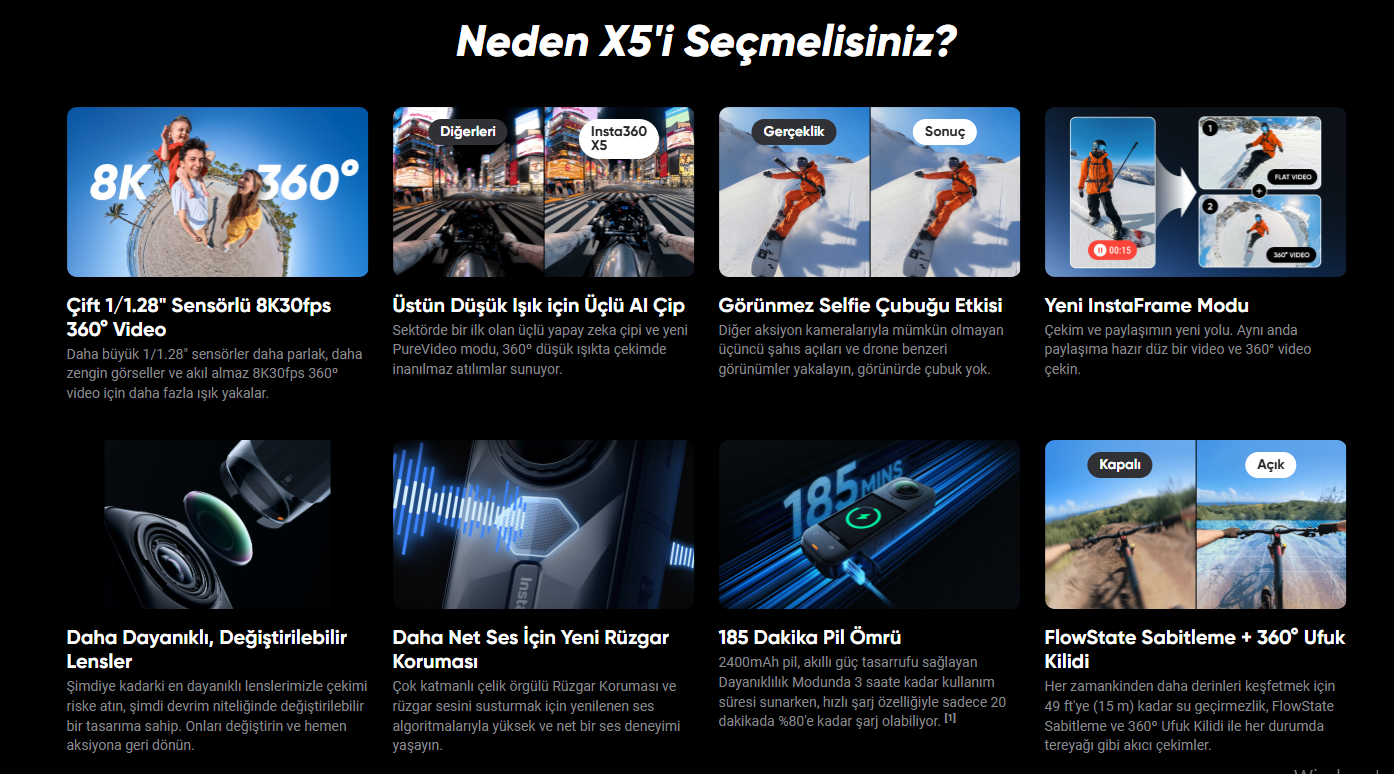 1. 8K 360 Derece Video Kaydı Yeni geliştirilen görüntü sensörü sayesinde Insta360 X5, 8K çözünürlükte 360 derece video çekimi yapabiliyor.