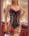 Göğüs kısmındaki dantel detayları zarafeti öne çıkarırken, ortadaki transparan tül formu ve bağlama şeritleri silueti çarpıcı biçimde vurgular. Yandan ve bacaktan geçen ince lastik detayları ise tasarıma karakter ve tutku katarken, vücudu daha çekici göstermeye yardımcı olur.