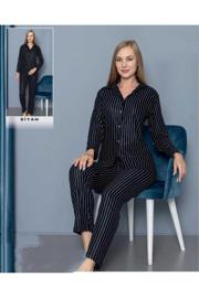Kadın pijama takımı, çizgili deseniyle göz alıcı bir görünüm sunar ve düğme detayları ile şıklığı ev ortamına taşır