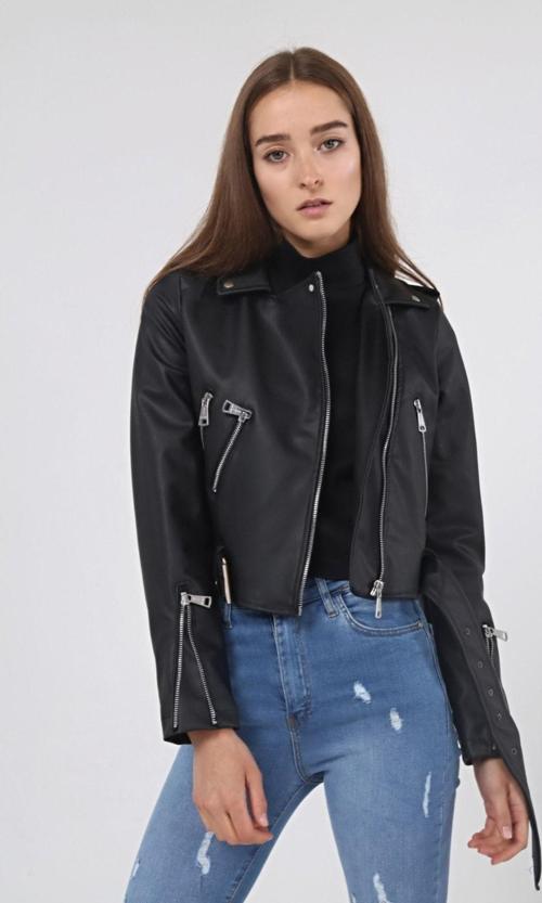 Kadın Giyim Pantolon Boy Cepli Deri Ceket Siyah L