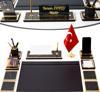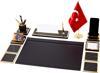 Masa düzeninizi sade ve şık şekilde tamamlamak üzere tasarlanmış 10 farklı parçadan oluşan mermer desenli ahşap parçaların, metal ayaklı türk bayrağı, deri sümenin ve isim ve ünvan baskılı masa isimliğininde yer aldığı bu şık set dilerseniz kendinize veya sevdiklerinize alabileceğiniz şık bir hediye olacaktır.
