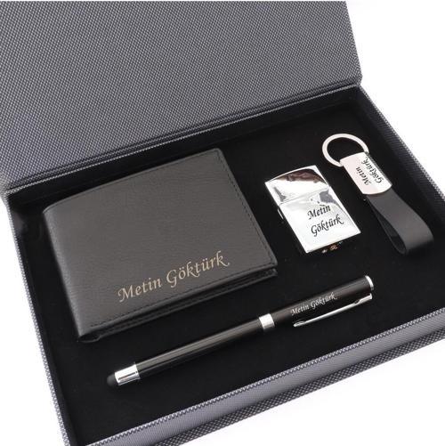 Set içerisinde 1 adet %100 Hakiki Deri erkek cüzdanı, 1 adet suni deri ve metal karışımı tasarım anahtarlık, 1 adet metal çakmak, 1 adet metal Roller Kalem, 1 adet özel tasarım hediyelik kutusu bulunmaktadır.