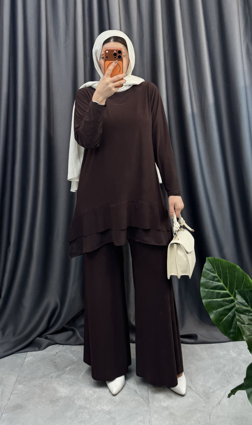 Şıklığı ve rahatlığı bir araya getiren volan detaylı ikili takım, modern ve zarif duruşu ile gardırobunuzun vazgeçilmezi olacak. Günlük kullanımdan özel davetlere kadar geniş bir kullanım alanı sunan bu takım, dökümlü yapısı ve ispanyol paça pantolonu ile her bedende kusursuz bir siluet oluşturur.