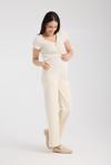- Yüksek bel tasarımı sayesinde karın bölgesini nazikçe sararak hamilelik döneminde konforlu bir kullanım sunar. - Esnek yapısı ile vücut hatlarınıza uyum sağlayarak rahat hareket etme olanağı tanır. - Krem rengiyle şıklığı ve zarafeti ön plana çıkaran bu pantolon, günlük giyimin vazgeçilmez parçalarından biridir. - Bol paça kesimi sayesinde bacaklarınızda ekstra genişlik hissi bırakmadan özgürce adım atmanızı sağlar. - Viskoz karışım materyali cildinizle dost dokunuşlar sunarken, polyester ve elastan bileşenleri esnekliği artırarak gün boyu rahatlık sağlar. - Günlük kullanım için ideal olan bu pantolon, hem evde hem de dışarıda keyifli anların vazgeçilmezi olabilir. - İthal malzemelerden üretilmiş olmasıyla kalite standartlarına uygunluk gösterirken, yerel üretim avantajıyla da desteklenmektedir. - Cepsiz yapısı pratiklik kazandırırken bol paça detaylarıyla modern bir görünüm sergiler. - Sade ve düz deseniyle kolayca kombinlenebilir; farklı üst giyim seçenekleriyle uyumu kolaylaştırır. - Düz silueti sayesinde her tür ayakkabıya mükemmel şekilde eşlik ederken, straight fit kesimiyle zamansız bir tarz sunar. - Sürdürülebilirlik bilinciyle üretilmiş olup çevre dostu malzemeler kullanılarak imal edilmiştir; böylece doğaya duyarlı tercihler yapmış olursunuz.