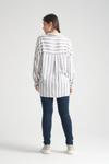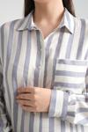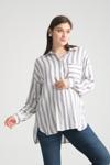 lacivert çizgilerin beyaz renk üzerinde spor bir görünüm alan viskon kumaşı hamilelik süresince ve sonrasında da kullanıma uygun tasarlanmıştır, anne adaylarının gömlek yada badi üstü spor bir görünüm yada pantolon üstü pfis bir gömlek, Oversize kesimi ile rahat bir kalıp